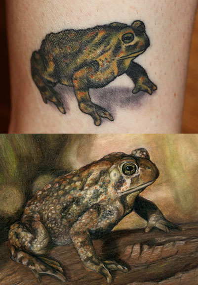 So how does this relate to my art at all? Well, since that first tattoo in 1999, I have kept getting more on and off, including a couple drawn by myself, and one drawn by my husband. Here is my toad tattoo. I love him. It is based on my drawing of a toad that really propelled me into drawing only toads. I am thinking about having him sitting on something, but whether that is a leaf, flower, strawberry or other I don’t know. He’s fine now, but I am addicted, so I wouldn’t mind adding to him.