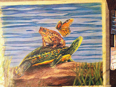 A painted turtle with a toad on top of him with a butterfly on him. First it was just a toad on a turtle, but I added a butterfly halfway through. Here it was a week ago: